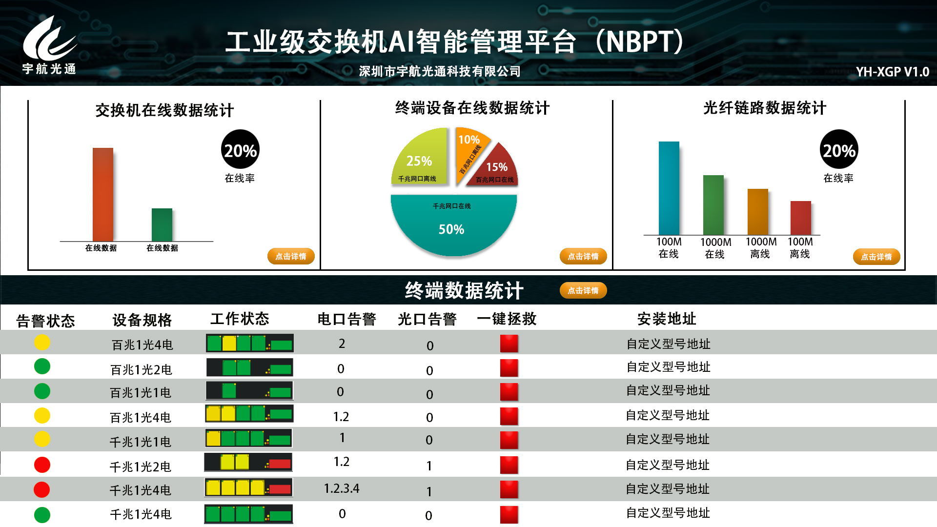 宇航專利產(chǎn)品:“小鋼炮”NBAI管理平臺(私有云),針對宇航自主研發(fā)的一層網(wǎng)管工業(yè)交換機內(nèi)嵌AI智能芯片和自主研發(fā)的AI底層驅(qū)動系統(tǒng),從而低成本實現(xiàn)傳統(tǒng)二層網(wǎng)管交換機的網(wǎng)管平臺功能。軟件可實現(xiàn):采用狀態(tài)可視化圖形管理,讓傳輸更簡單、主管;全網(wǎng)設(shè)備自動識別統(tǒng)計、工作狀態(tài)自動分析統(tǒng)計,動態(tài)拓撲圖讓傳輸更透明;前后端IP設(shè)備工作狀態(tài)分析、設(shè)備自動識別統(tǒng)計;前端IP設(shè)備定位,全網(wǎng)智能掃描,故障實時預(yù)警,維護和解決故障更簡單無需長途奔波;項目集中管理,讓運維效率更高,成本更低。
