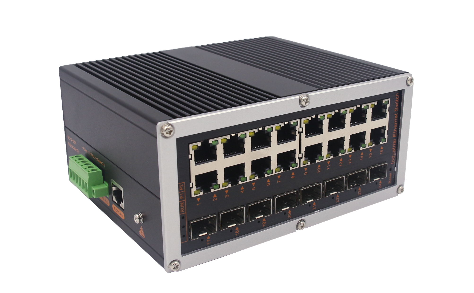 8個千兆光+16個千兆電、SFP接口(不含光模塊)、導軌式、DC12-52V供電 |