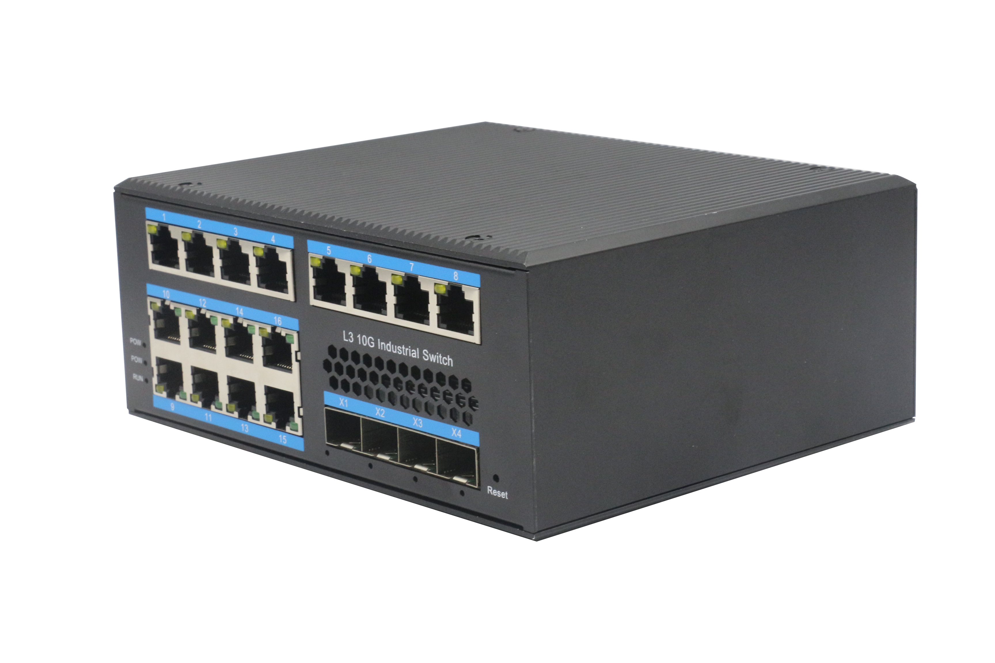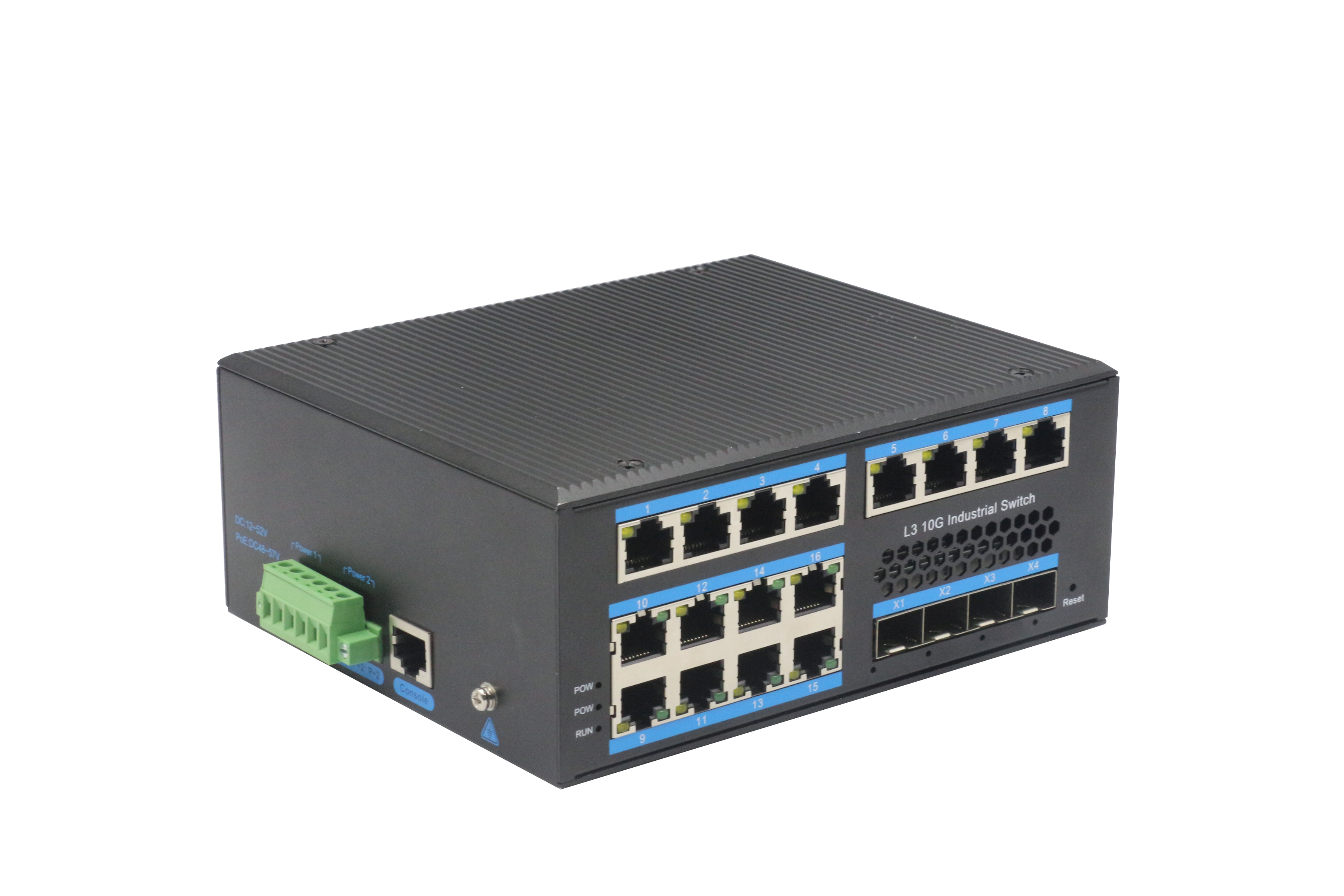 強三層網管M系列4個SFP+光(支持千兆/萬兆)16個電口,-導軌式 - DC12V-52V-寬溫(-40℃-80℃)。默認不含AC電源適配器和SFP模塊